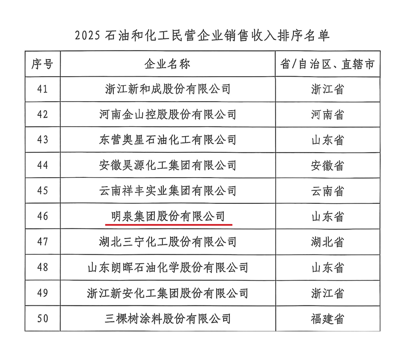 近日,中国石油和化学工业联合会正式公布了《2025石油和化工民营企业销售收入排序名单》,明泉集团凭借卓越的经营业绩和稳健的发展态势,位列榜单第46位,展现了明泉在行业中的强劲实力与品牌影响力。
