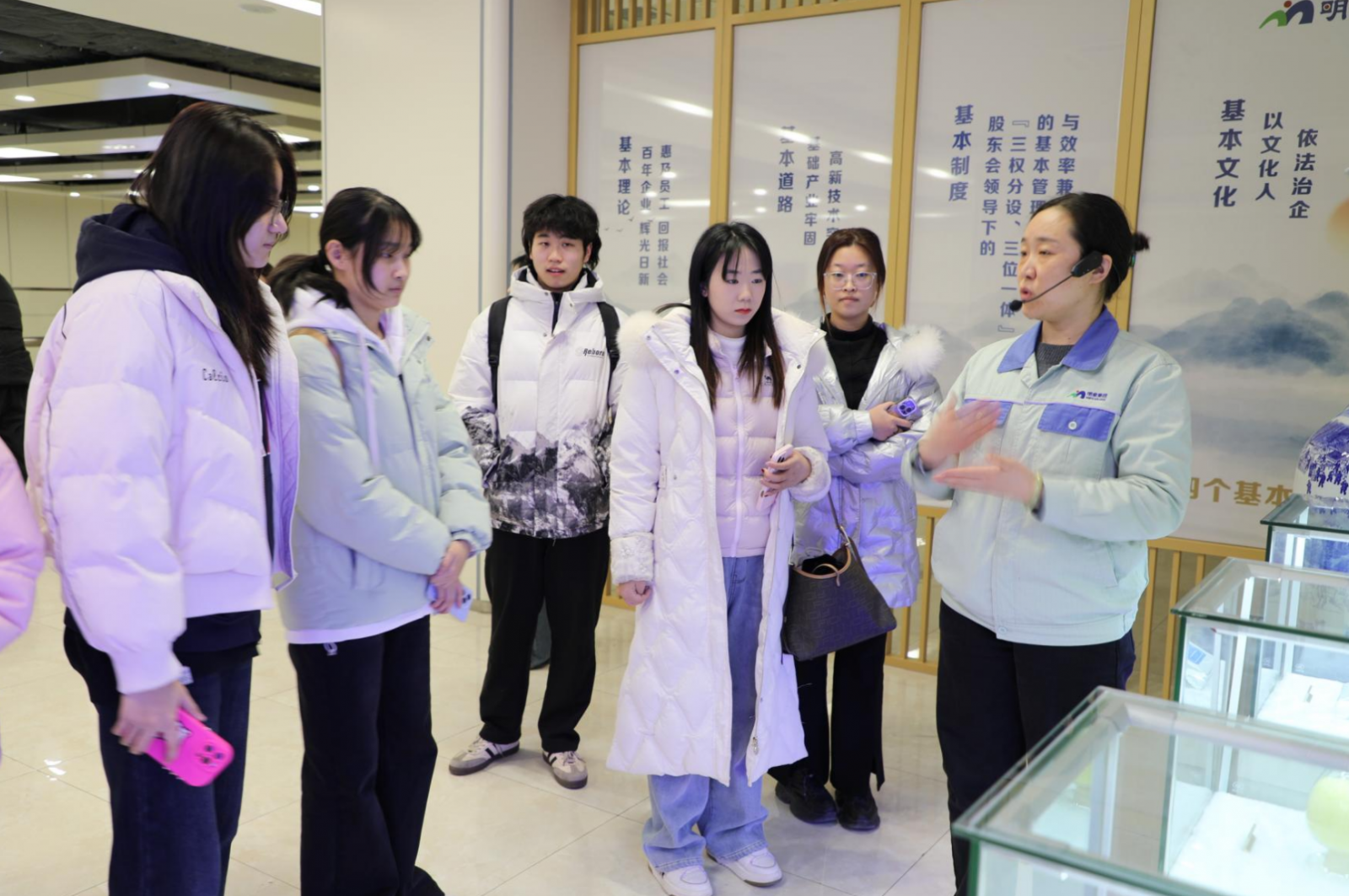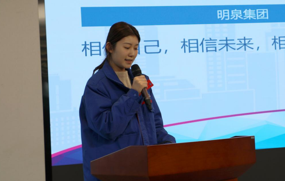 在明泉之源展厅,学生们在讲解员的引导下,系统了解了企业的发展历程、产业布局、创新成果以及独具特色的企业文化,让抽象的工业企业发展史变得可触可感。座谈会上,学子们观看了展现本土青年奋斗精神的宣传片《青春无惧》与明泉集团形象片《自强不息实业报国》。